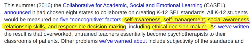 In 2017, Dr. Karen Effrem and Jane Robbins co-authored an article that lists the five non-cognitive factors CASEL would use for measuring children in K-12 SEL standards: