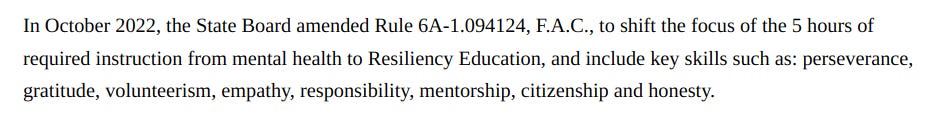 In October 2022, Florida's State Board of Education, with the support of Casey DeSantis, “shifted” the focus of mental health instruction to “Resiliency Education”; they are playing word games. We still have the same intervention programs in classrooms we had when it was called SEL and Mental Health.
