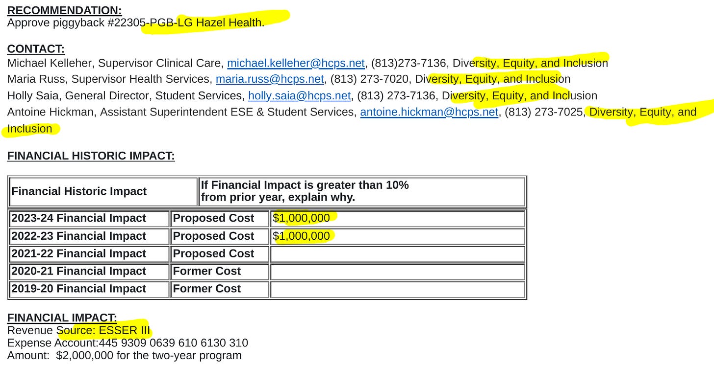 Yet another program used in many school districts is Hazel Health, a K12 online medical and mental health care company. In Duval County Florida, the program offers “...health care services for all students, at no cost to families.” It sounds like they don’t consider taxpayer funding a “cost” to taxpayers. In Hillsborough County, FL the funding for this program has come from Florida Department of Education’s participation in the federal government’s taxpayer funded ESSER III program, or American Rescue Plan (ARP). Florida secured 7 billion in funding from the Elementary and Secondary School Emergency Relief Fund (ESSER III).