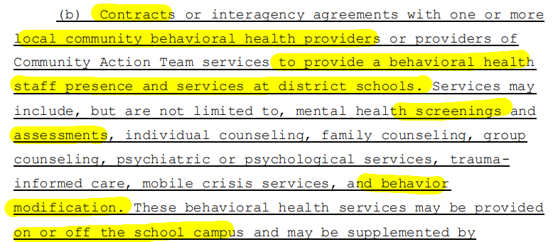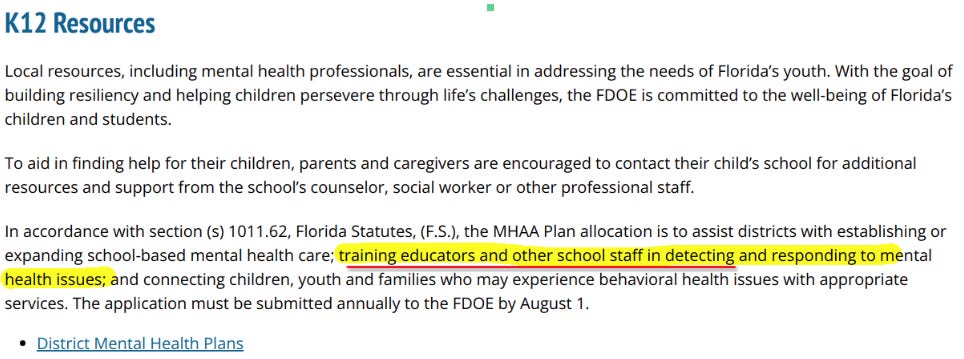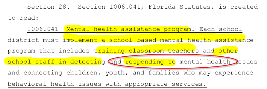 Earlier this year Florida’s legislature pushed for more mental health intervention in schools, requiring school districts implement SCHOOL-BASED mental health assistance that includes training classroom TEACHERS and other staff (who’s that?) to DETECT and RESPOND. Does that mean to LABEL students and PERFORM INTERVENTIONS?