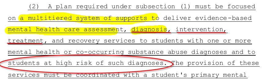 Florida legislation requires school districts submit plans that focus on a “multi-tiered system of supports” (MTSS) to deliver assessments, DIAGNOSE, and perform INTERVENTIONS and TREATMENT even to students who are “at high risk”, (i.e. treatments when NOT diagnosed)!