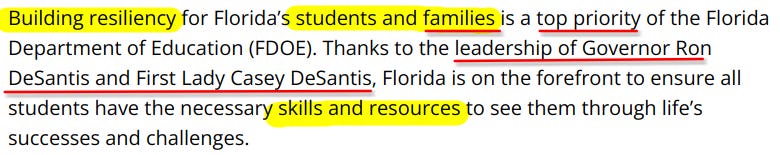 Casey DeSantis took Resiliency Education under her wing; she and the Florida Education Commissioner Manny Diaz can call it what ever they want, the current Florida Department of Education website and Florida legislators make it very clear in Florida statutes what they mean: