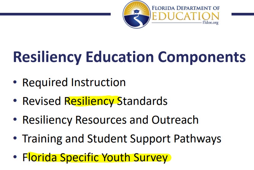 Interestingly, Florida’s Resiliency Education Components include a new “Florida Specific Youth Survey” (FSYS) that is “administered alongside” the Florida Department of Health’s Florida’s Youth Tobacco Survey (FYTS) and Florida Department of Children and Families’ (DCF) Florida Youth Substance Abuse Survey (FYSAS). The surveys are administered in schools.