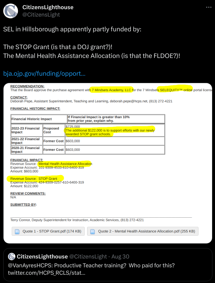 The funding for this program not only comes from the Florida Department of Education’s Mental Health Assistance Allocation but also from the U.S. Department of Justice (STOP Grant). Yes, The U.S. DOJ is now funding Marxist mental health programs in Florida schools, excuse me—I meant “Resiliency Education”.