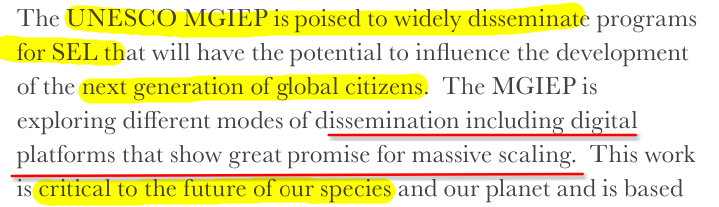 In a 2019 UNESCO issue of The Blue Dot on Social Emotional Learning, we have the urgent call that SEL is “critical to the future of our species”. So, if you do not adopt their SEL programs you are destroying humanity! And...they want your children to become GLOBAL citizens, not US citizens.