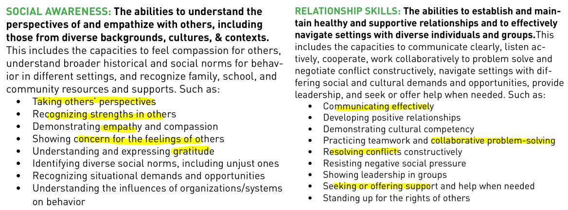 Many other Florida Specific Youth Survey questions mimic the CASEL Framework bullet-points from the two categories below almost perfectly (“social awareness” and “relationship skills”).