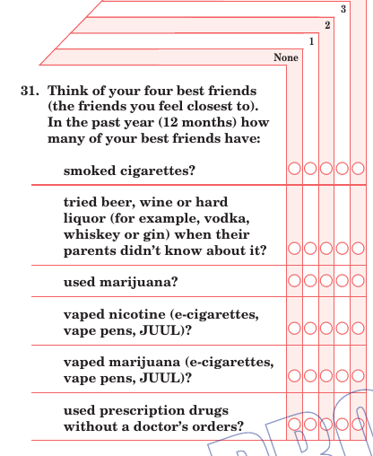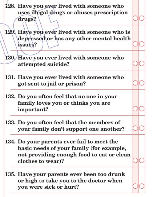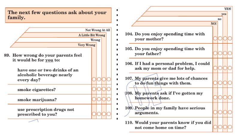 Below is an excerpt from the high school version of the Substance Abuse Survey. It includes questions about family and home life, such as: “Have you ever lived with someone who got sent to jail or prison?”