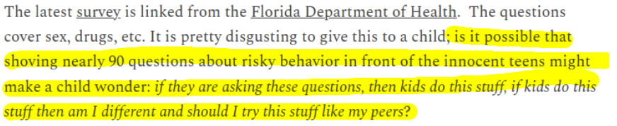 Florida’s state surveys introduce topics and terms to innocent children. Aside from questions being wildly inappropriate, survey questions might increase the frequency of risky behavior, not be 100% private, make fools of children, pry into family life, and if administered with passive consent: violate parental rights.