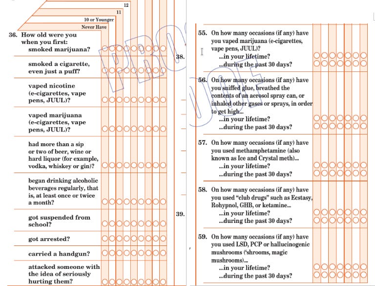 There are questions about use of cocaine or “crack”, Crystal meth, Ecstasy, LSD and PCP, Vicodin, Percocet, heroin, Ritalin, sleep habits, beating people up, taunting people, instant messages, how often the child has attempted suicide, considered suicide, committed theft, carried a handgun, sold drugs, etc.