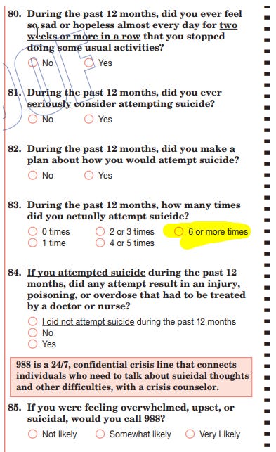 In the survey below, they ask if a child has attempted suicide 6 or more times in the past 12 months. What message might this convey to a child? This is horrifying! Could this possibly increase suicide attempts among children? Lead a child to believe that suicide is normal to attempt? Might a child think this means attempted suicide does not result in death?